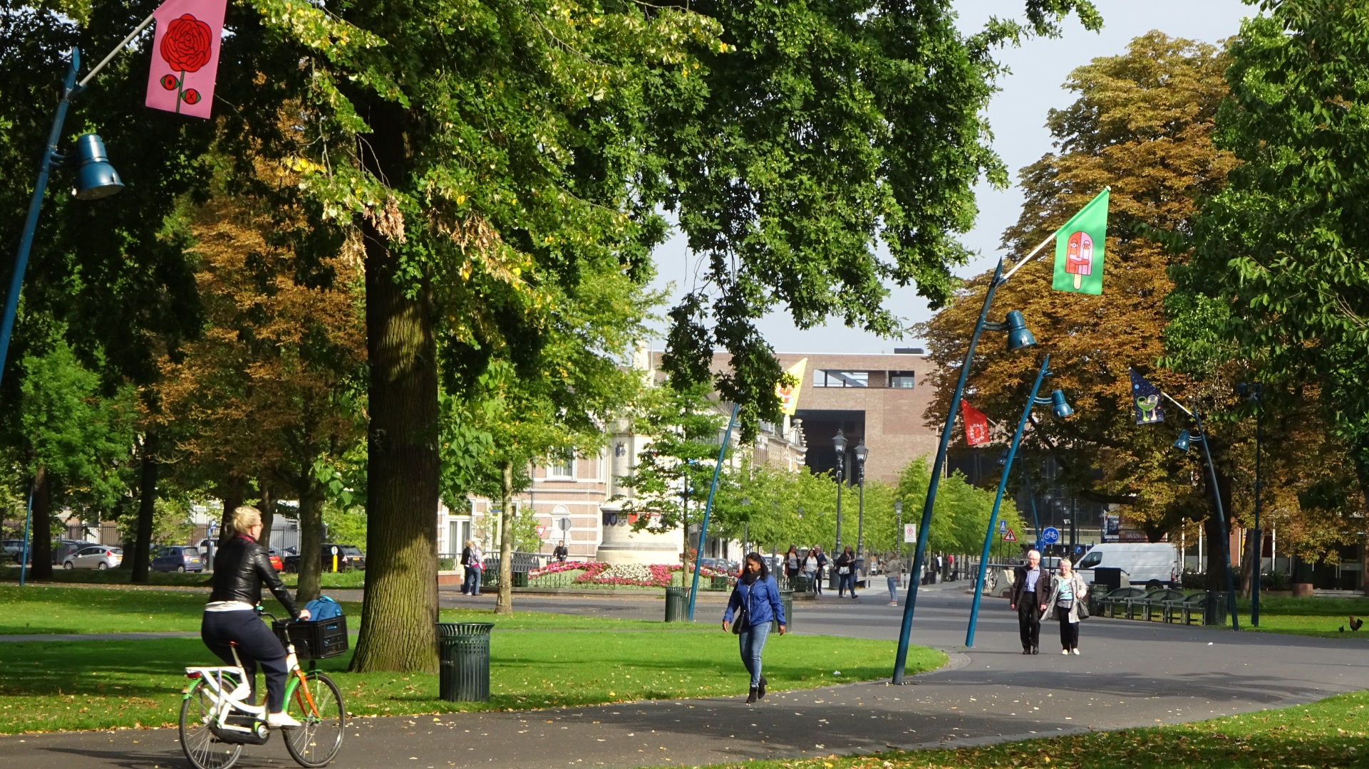 Wandelaars en fietsers in stadspark het Valkenberg