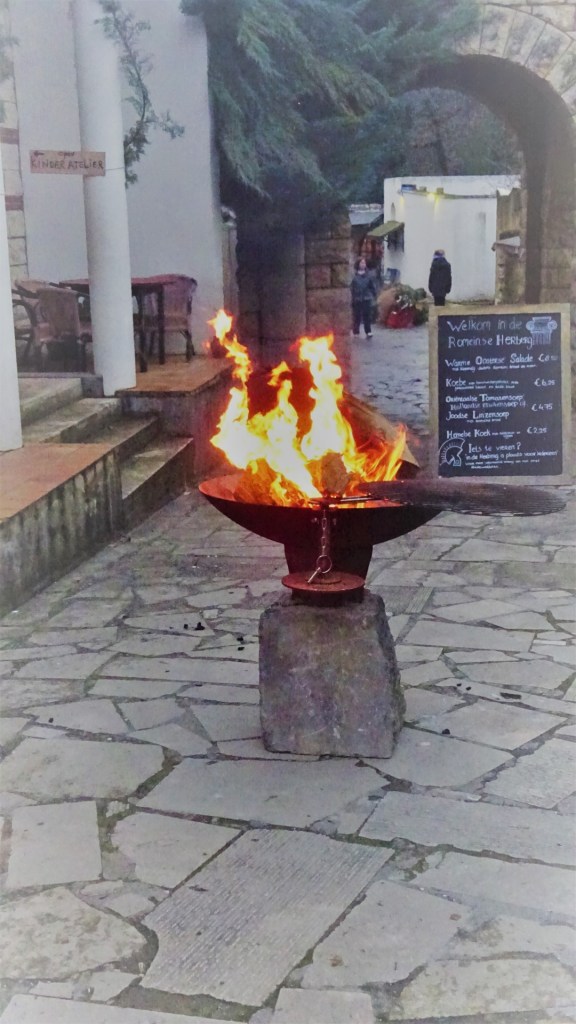 In de Romeinse herberg streken we even neer. Het was warm en behaaglijk binnen in het Romeinse verblijf. Buiten knetterde het hout in de vuurkorf.