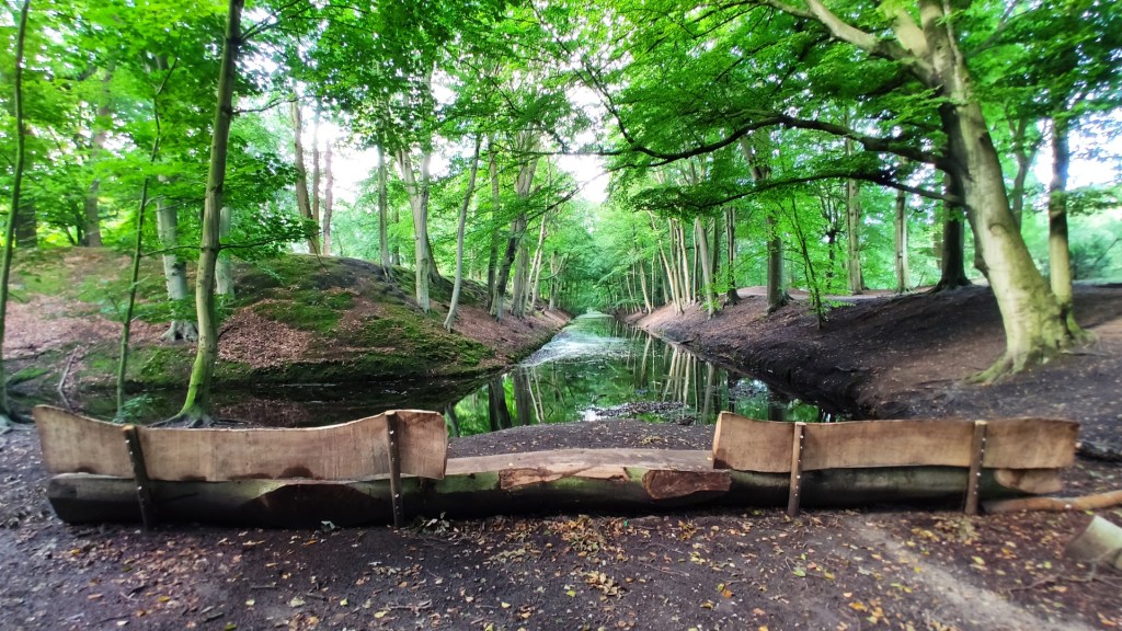 We liepen verder over de slingerpaden en onder de grote monumentale bomen. Aan de kant zagen we een Nijlganzenpaar. Hun kroost was al uitgevlogen. We vervolgden onze wandeling en liepen in een bos met hoge beuken. Als ik zo omhoog keek en de hoge bomen zag, voelde ik me zo nietig. We streken even neer op een enorme bank bij het water. De gigantische bomen weerspiegelden in het water.