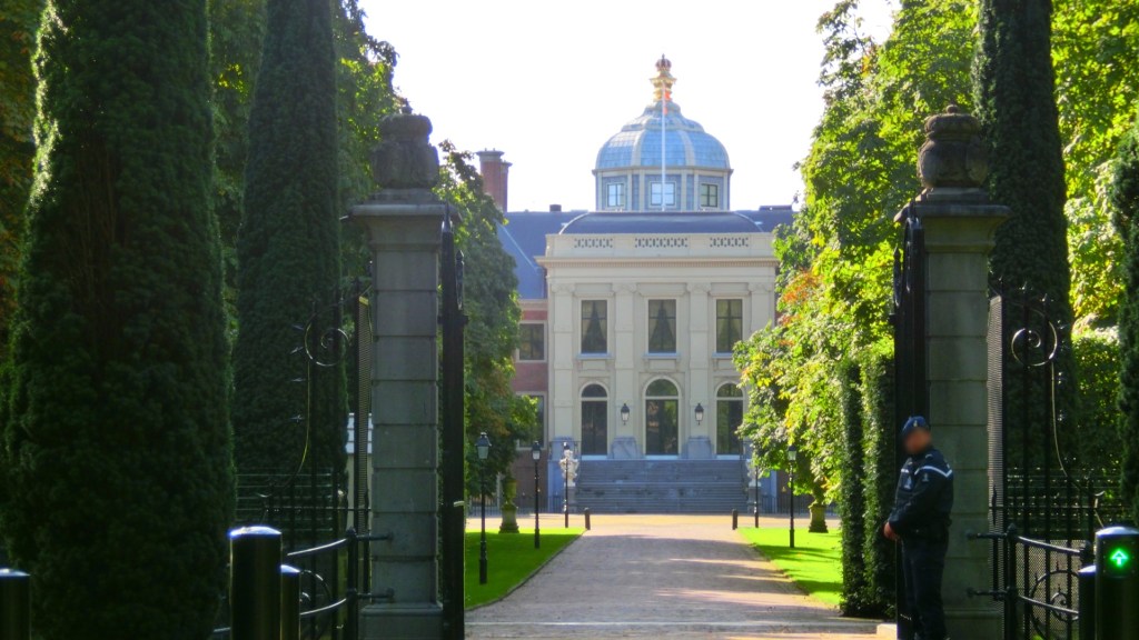 We kwamen bij een grote vijver waar meerkoetjes en wilde eenden op het water dobberden. Midden in het bos lag Paleis Huis ten Bosch, dat nu het woonadres is van Koning Willem Alexander en Koningin Maxima en hun gezin. We passeerden het koninklijk paleis en vooraan het hek stond een beveiliger.