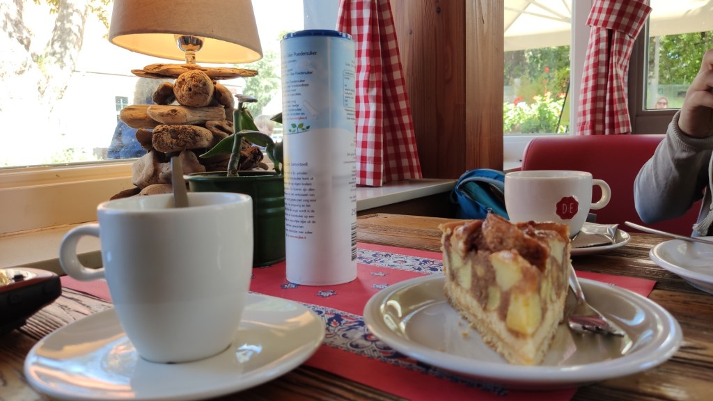 We schreven onze naam en telefoonnummer neer op het Coronaformulier en moesten door een doolhof van spatschermen door totdat we bij het zelfbedieningsgedeelte kwamen. We bestelden appeltaart met koffie en gingen zitten aan een houten tafel bij een raam met rood wit geblokte gordijnen. We zetten onze taart en koffiekopjes neer tussen de poedersuiker en de schenkstroop.
