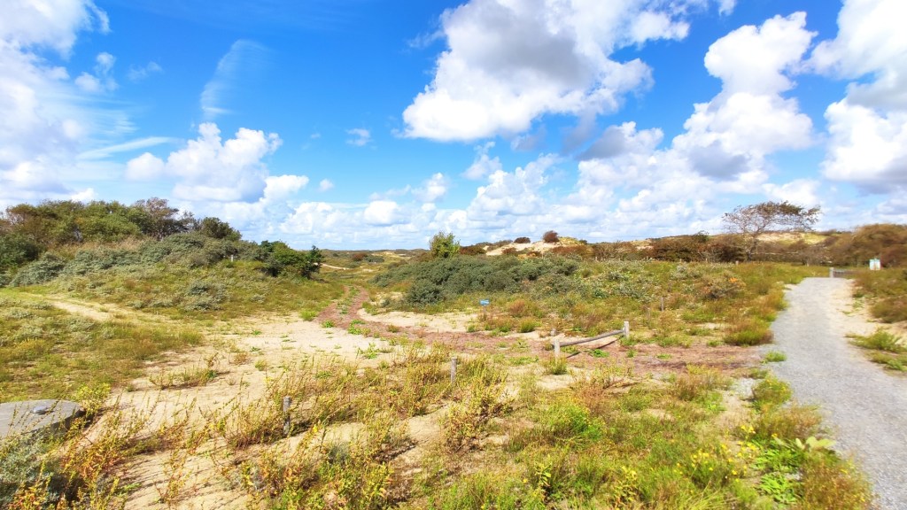 We liepen over de volle parkeerplaats heen. We wandelden verder richting de duinen. We gingen een klaphek door en de verharde paden werden ingeruild voor zandpaden. We wandelden duinpan op en duinpan af. Het was best pittig om in het mulle zand te lopen. Mijn wandelschoenen zakten weg in het zachte zand. We klommen tegen de zandberg omhoog.