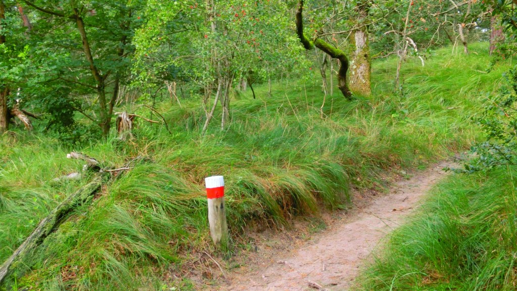 Het was een behoorlijke inspanning zo in de staart van de wandeling. De rode witte routeaanduiding was inmiddels vervangen door rode paaltjes.