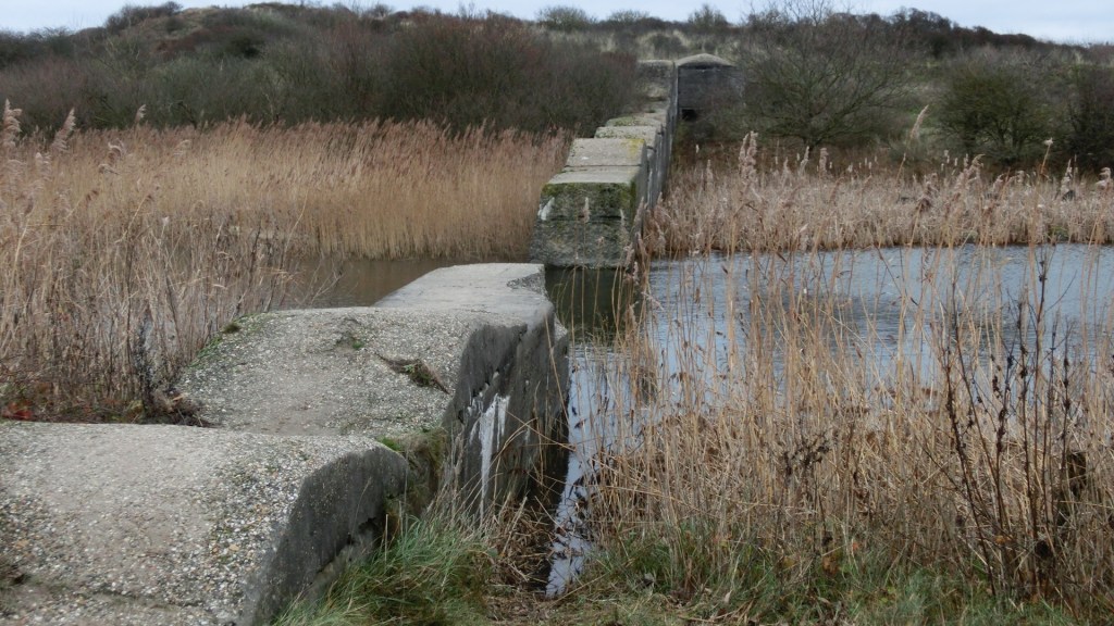 We kwamen bij een hek waarachter een betonnen golvende muur lag. Het waren de resten van de Antlantikwall. De tankmuur liep vroeger van de kust verder landinwaarts. De golvende bovenkant moest herkenning vanuit de lucht bemoeilijken.
