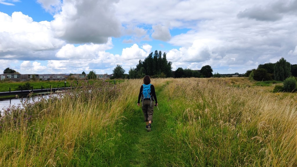 Een prachtige Hollandse lucht hing boven ons. Het pad was omzoomd met hoog gras en de kleine witte bloemetjes van het fluitenkruid. Een man met een hond liep voor ons. In de verte zagen we nog twee wandelaars met rugzak. Ze liepen het Pieterpad. Ze wandelden langzamer dan wij en wij kwamen steeds dichterbij.