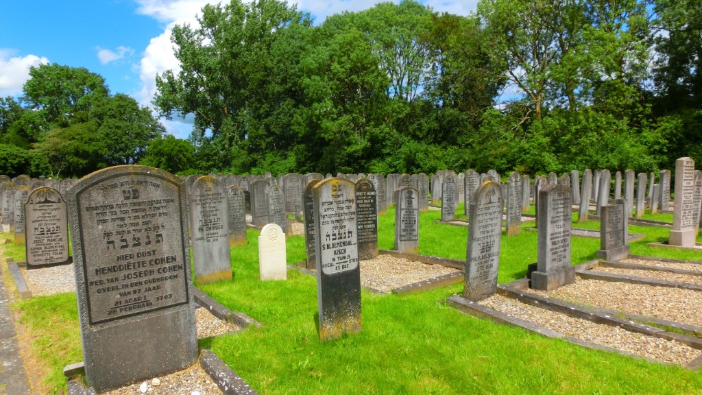 We kwamen bij de Selwerderhof, de grootste begraafplaats van Groningen. Deze werd aangelegd tussen 1940 en 1949. We besloten om geen ronde over de begraafplaats te maken, maar de naastgelegen Joodse begraafplaats aan de Iepenlaan te bezoeken. Ik liep tussen de scheve graven door. Op deze plek vinden sinds 1909 joden hun laatste rustplaats.