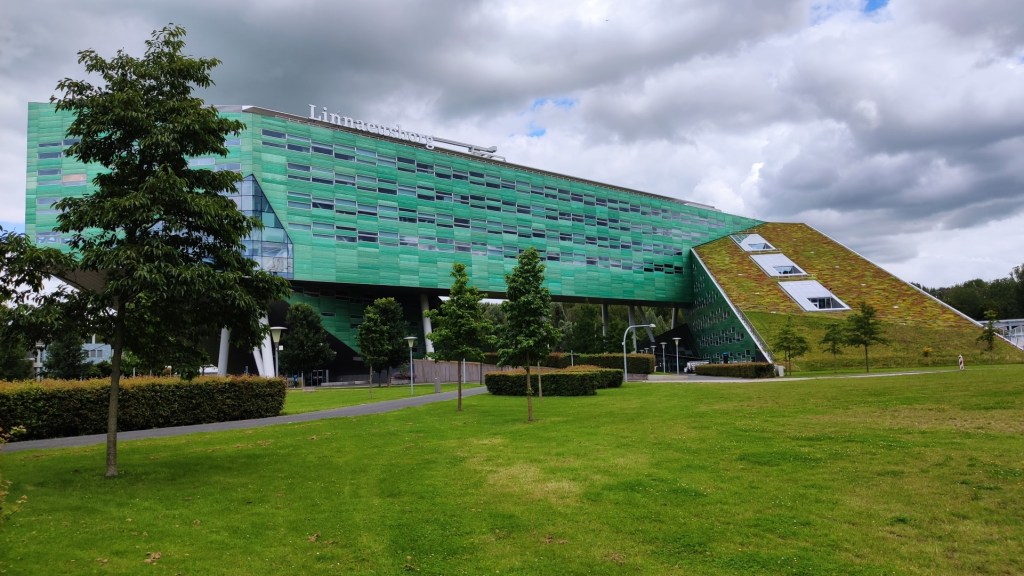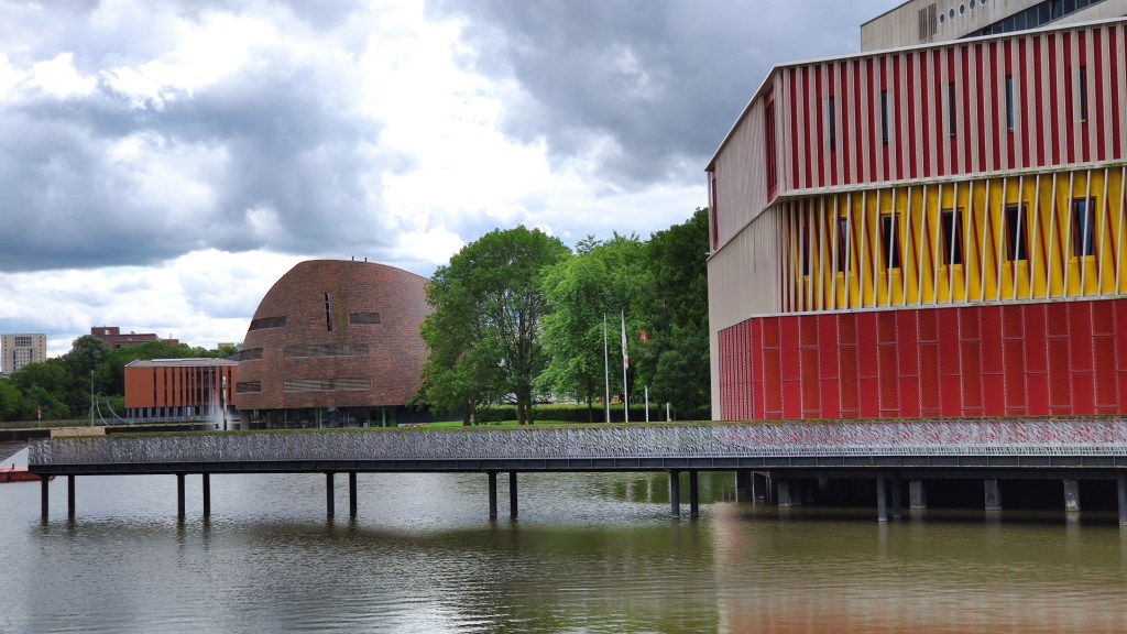 De gebouwen waar ik mijn studie volgden waren er nog, maar vielen in het niet bij de architectonische hoogstandjes, die nu op het terrein te zien waren. Ik herkende mijn oude studieplek amper terug. We liepen langs een gebouw met rood gele strepen, in het kleurrijke gebouw is de Universiteitsbibliotheek gevestigd.