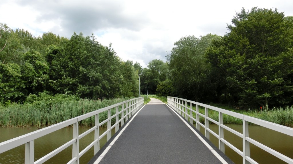 Dit was niet het mooiste deel van de wandeling. Het was behoorlijk doorbijten op dit deel van de route. Nog steeds wandelden we achter de man en de vrouw met de grote rugzak. We werden ingehaald door fietsers. Grote schepen voeren door het kanaal. Ik hoorde het geluid van klotsend water tegen de kade. Vaag kon ik me dit deel van de route nog herinneren toen ik het Pieterpad liep. Zo’n twee kilometer liepen we langs het kanaal. We passeerden de twee Pieterpad wandelaars en we sloegen af richting het universiteitsterrein.