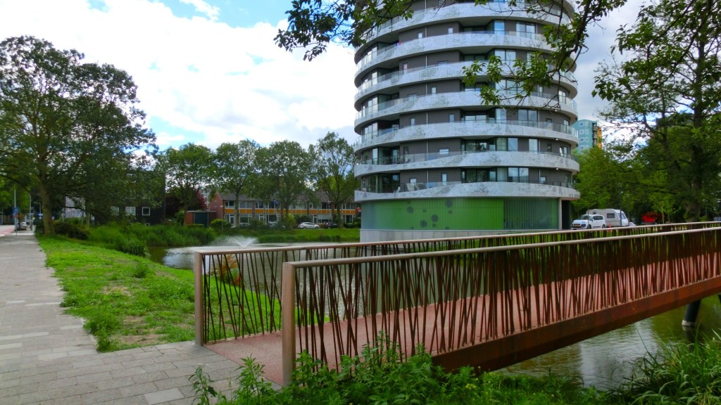We struinden verder tussen de lage flats van de Groningse stadswijk. We wandelden door straten met planetennamen. Op sommige punten waren de laagbouwflats vervangen door nieuwbouw. We wandelden de naoorlogse woonwijk uit en gingen verder over een Jaagpad langs het Reitdiep. We gingen een brug over en kwamen bij één van de pareltjes tijdens onze wandeling, de Reitdiephaven.