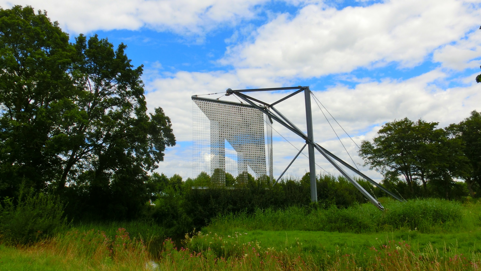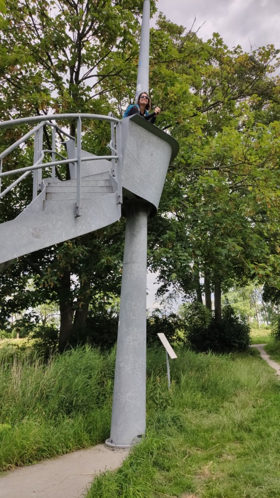 Aan het eind van de laan kwamen we bij een uitzichttoren. Ik beklom de toren en had een overzicht over de Huppels. We kwamen weer bij het Van Starkenborchkanaal en stonden oog in oog met een grote stalen constructie. Het kunstwerk van Gunnar Daan moet de stadsmarkering voorstellen. We verlieten voor de tweede keer het kanaal en liepen de bebouwing van de woonwijk Selwerd in.