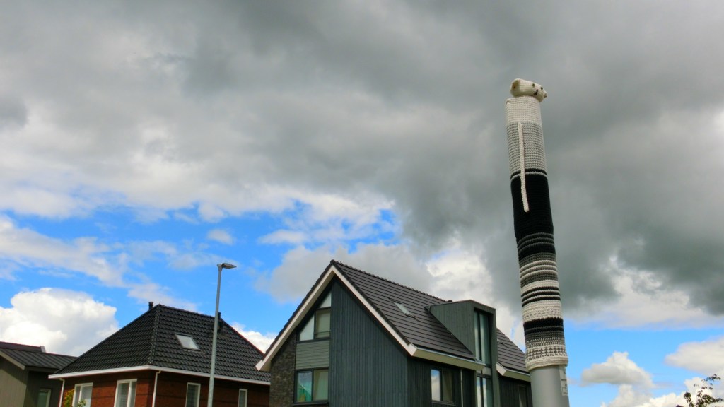 We besloten om even te gaan schuilen bij één van de winkels aan de haven. Toen de ergste regen voorbij was, kochten we een ijsje bij lunchroom De Ideale Buurman. We peuzelden ons ijsje aan de rand van de haven op. We verlieten de kleurrijke bebouwing en wandelden verder tussen nieuwbouwhuizen. Langs ons pad waren de lantaarnpalen voorzien van fleurige breisels. Ze hadden het straatbreien ver doorgevoerd, want elke lantaarnpaal was opgevrolijkt met een wollen jasje. We kwamen wederom bij het Reitdiep.