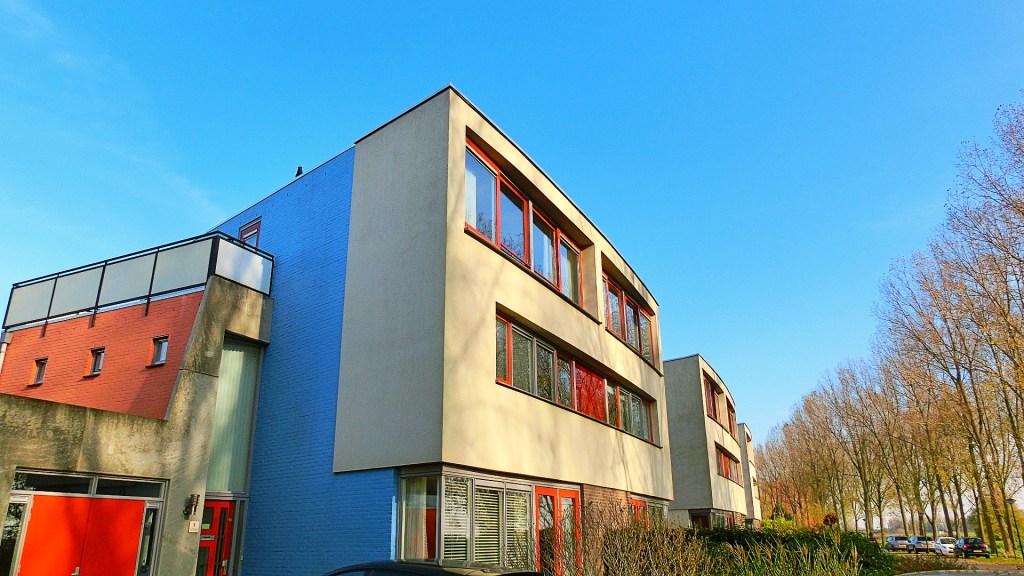 We kwamen bij de school “Het Spectrum” en staken het schoolplein over. We wandelden verder over de Prismastraat en passeerden weer supermarkt Deen. We liepen langs het project Rhapsody Blue van de architect Sjoerd Soeters. De blauwe woningen met metalen trappen aan de voorkant deden me denken aan huizen, die ik in de New Yorkse wijk Brooklyn had gezien. Het was inmiddels lunchtijd geworden en we gingen zitten op een stenen muurtje. Ik at mijn boterhammen uit mijn meegebrachte broodtrommel.