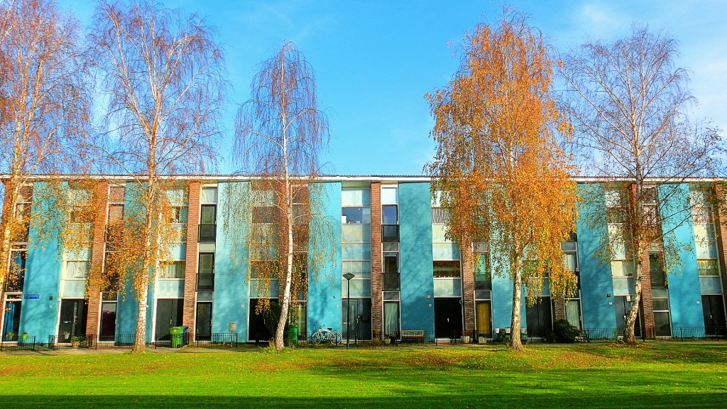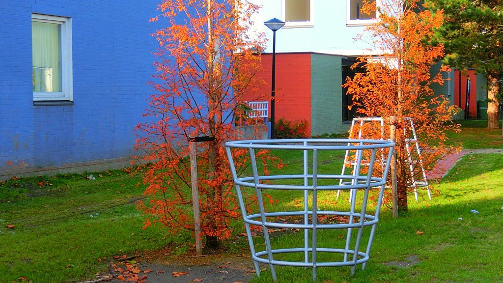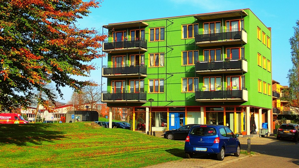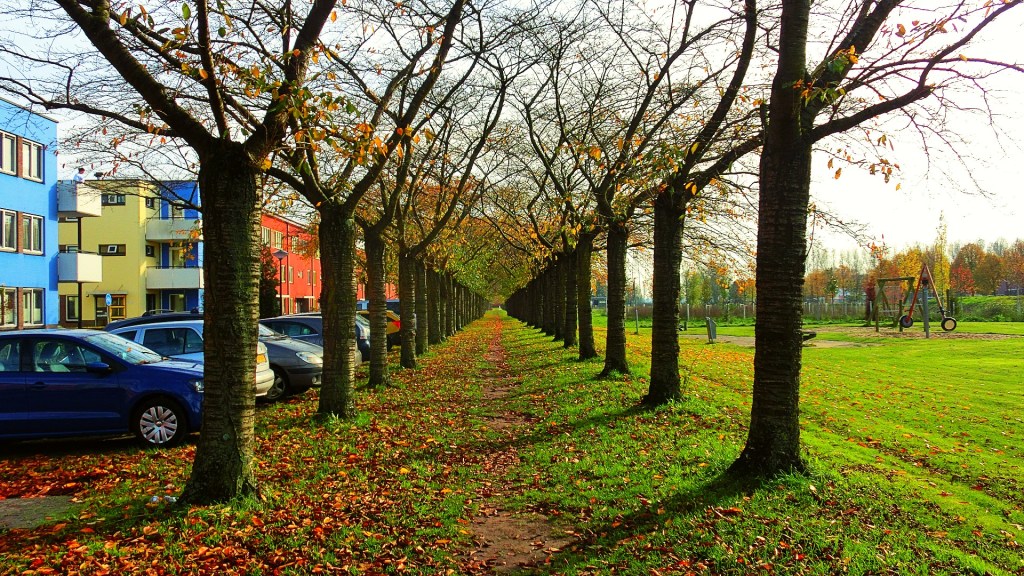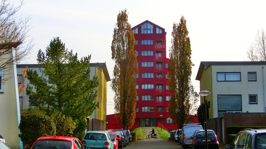 We passeerden een groenstrook met een groen appartementencomplex. De bomen met groen en rode herfstkleuren vond ik perfect passen bij de groene flat. Vind je ook niet?!