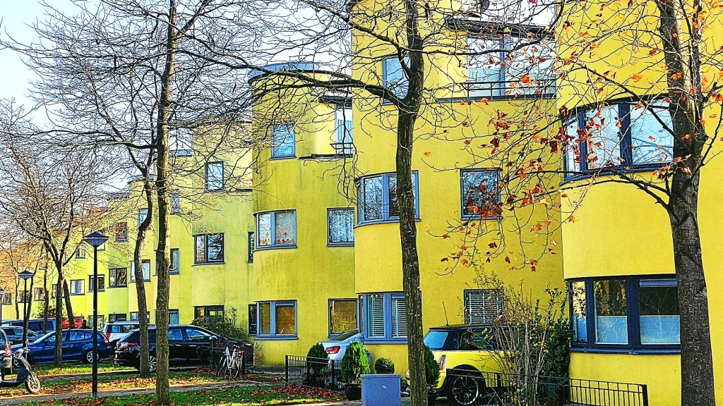 Een aantal huizen was fel geel. Bij een paar huizen had ik het idee of ze verkeerd gewassen waren. De gele kleur was sterk verbleekt. We kwamen weer op de Regenboogweg en sloegen snel daarna de Chamoisstraat in waar we wederom de torenwoningen tegenkwamen.
