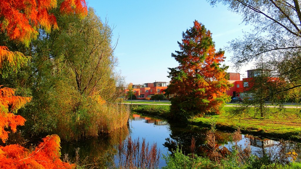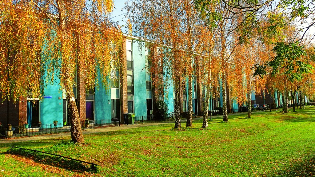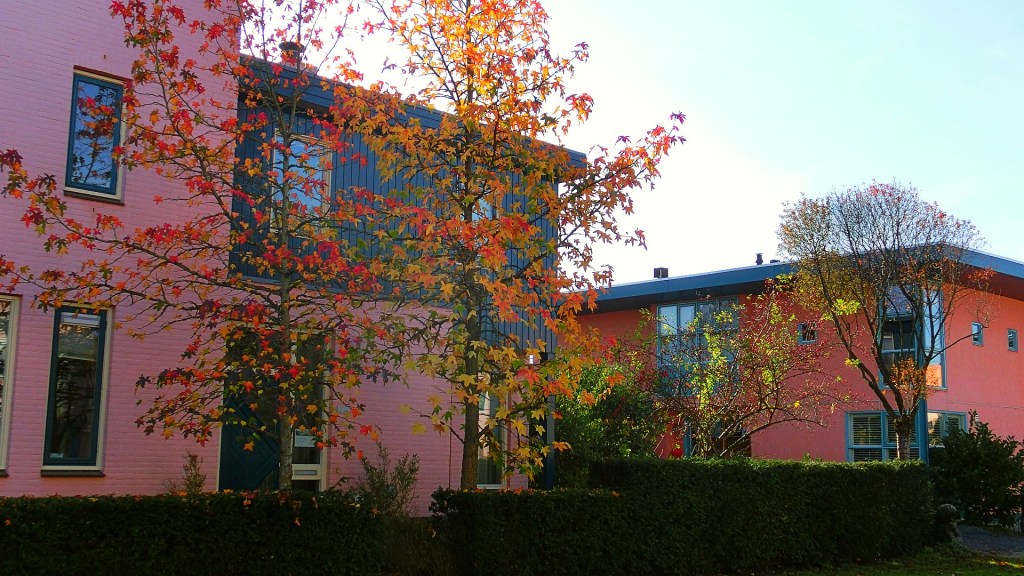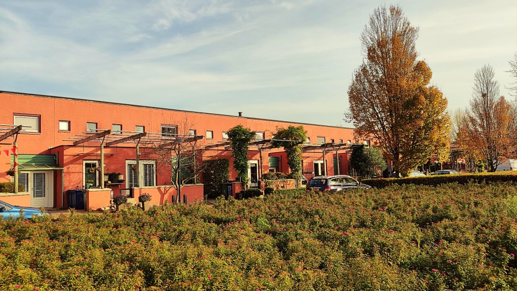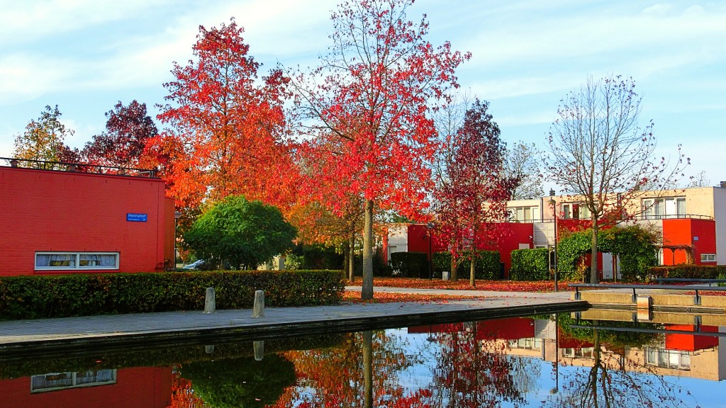 We passeerden het Robijnplantsoen omringd met bomen in fantastische herfstkleuren. De roodoranje woningen aan de vijver zijn ontworpen door Kees Rijnboutt. Hij werd geïnspireerd door de architectuur van het Papaverhof in Den Haag van Jan Wils. Ik bleef maar plaatjes schieten van de huizen en de dennenbomen met fraaie herfsttinten.