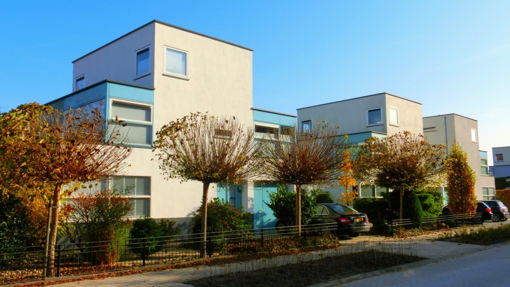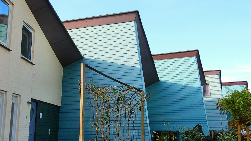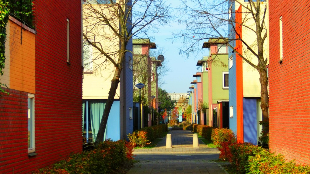 We vervolgden onze route en kwamen op de Siennastraat, die overging in de Scharlakenstraat. Dit deel van de buurt was ontworpen door Geurts Schulze Architecten. Architect Jeroen Geurts liet zich inspireren door het werk van de Duitse architect Bruno Taut.