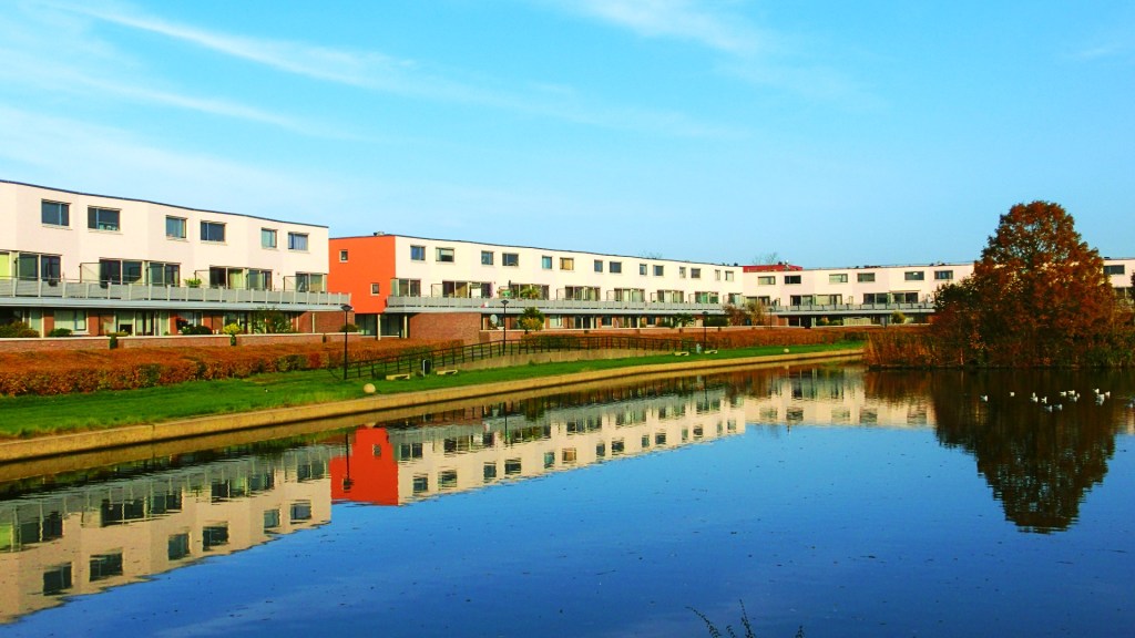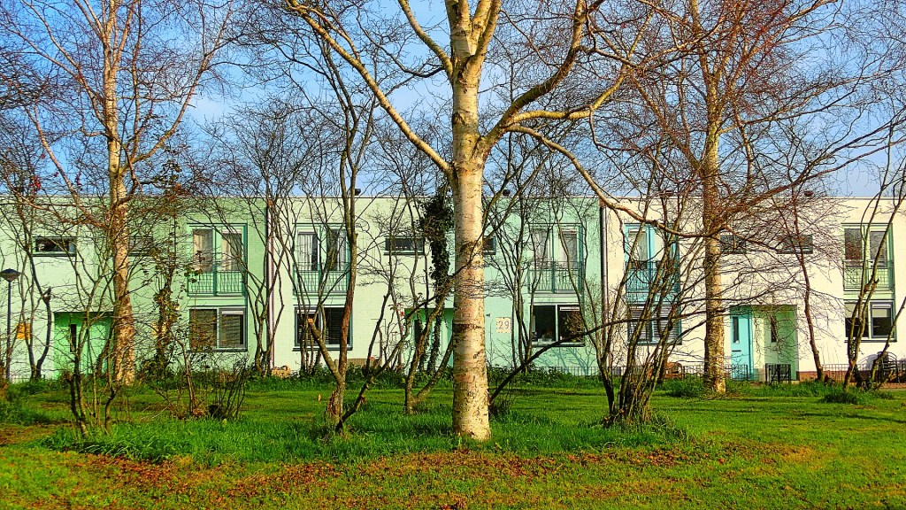 We kwamen bij de Paarlemoervijver waar we een enorme wand met woningen zagen. Het was een golvend geheel om te zien. Op het water dobberden kokmeeuwtjes. We liepen verder tussen de huizenblokken en kwamen bij het Jadeplantsoen met lage woningen in pasteltinten.