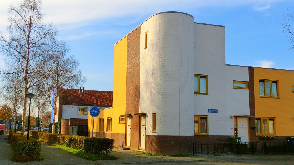 We wandelden verder door de Okerstraat met huizen in geel en creme-wit. De huizen in deze straat zijn ontworpen door OTONOMO architecten. De architectuur deed me denken aan de Kiefhoek Rotterdam.