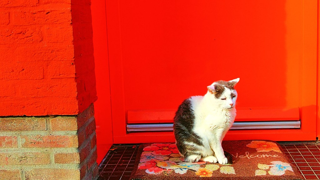 We wandelden verder over de Mahoniestraat waar rode galerijflats aan lagen. We vervolgden de straat en de flats werden ingeruild voor kleine woonblokken in rood en oranje. Ik stopte even bij één van de huizen om de kat te fotograferen.