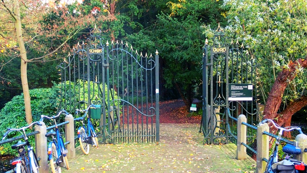 We wandelen het Park uit en gaan over een stenen boogbrug door het donkergroene toegangshek met goudenkleurige punten en  letters “Schoonoord”. We lopen over de smalle slingerpaden. Het najaar heeft zijn intrek genomen en de meeste bomen in het park hebben hun bladeren laten vallen of staan nog in herfsttooi. We wandelen langs de vijver en jong en oud genieten van de rust van dit wonderschone park.