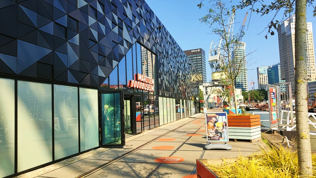 We gingen met de metro naar de opstapplaats van de Spido. Voordat we met onze boottocht startten, hadden we nog wat tijd over en gingen we het spiksplinternieuwe Leuvepaviljoen van dichterbij bekijken. We liepen langs het nieuwe gebouw dat tussen de Leuvehaven en de Schiedamsedijk ligt. Het ontwerp van Port Pavilion, zoals het multifunctionele gebouw ook wordt genoemd, is van de hand van MoederscheimMoonen Architects, ook wel bekend van het creatie van bollendak bij Utrecht Centraal. In het gebouw zitten het informatiepunt van het Havenbedrijf, het Martitiem Museum en twee horecagelegenheden gevestigd.