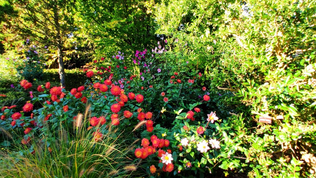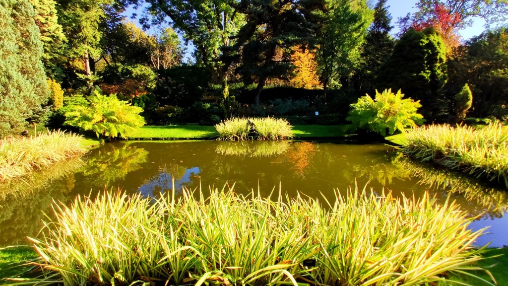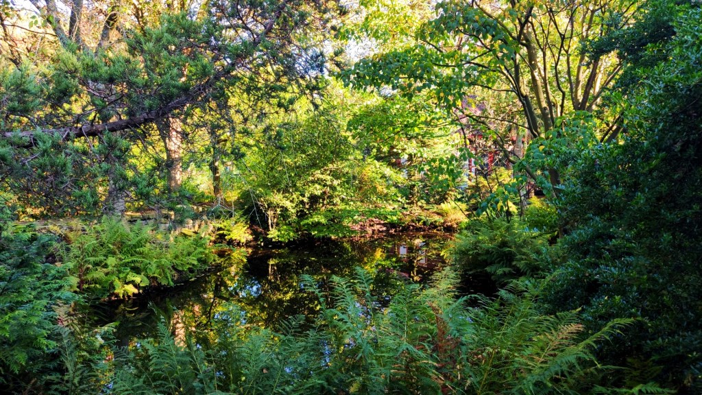 Na deze heerlijke versnapering ging onze route door de Formele tuin met een vijver omringd door varens en grassen. Hier en daar stonden coniferen in diverse hoogten en vormen.
