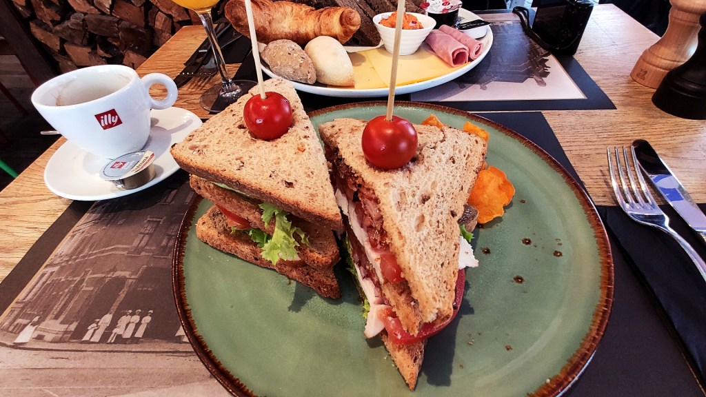We streken neer bij het restaurant “Aan het strand van Oostende”, waar het zowel op het verwarmd terras als binnen gezellig druk was. Vele gasten zaten nog aan een brunch bord. Het was nog voor half twaalf en ik bestelde ook zo’n bord met een croissant, broodjes, een gekookt eitje en diverse smeersels. Een goede bodem samen met een verse jus om de stad te verkennen.