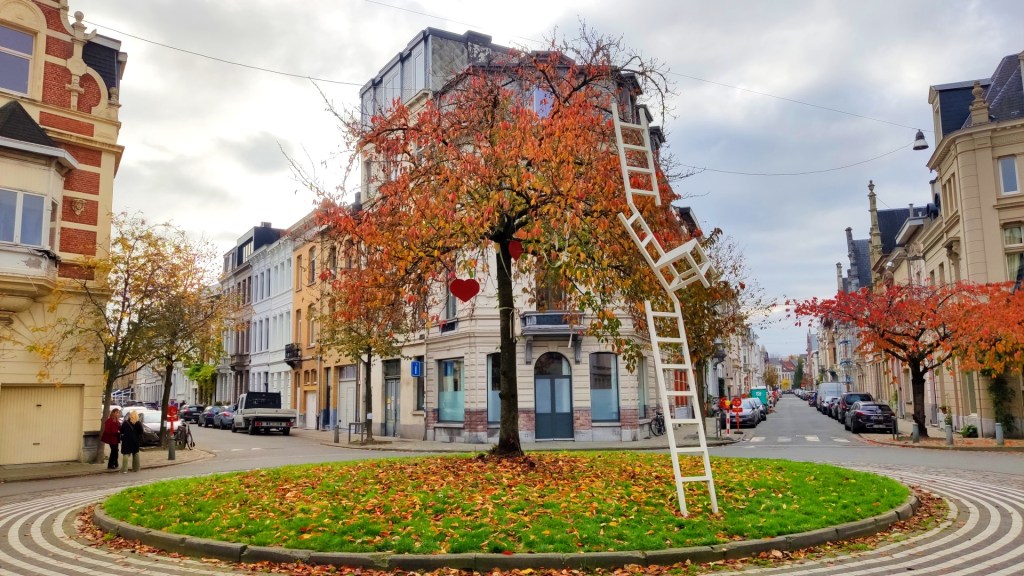 Op de rotonde van Lange van Ruusbroecstraat vonden we een stalen ladder, die onderbroken werd door een stoel. Het kunstwerk “Penarie” is van de kunstenaar Nick Hullegie. De creatie was een fraaie combinatie met de boom, die in herfsttooi stond.