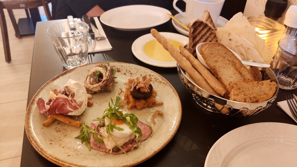 We startten onze Italiaanse smaaksensatie met de “Antipasta misti”, een proeverij van voorgerechten. In een hele korte tijd stond een bord voor heerlijkheden voor ons. Het enige dat ik niet lustte was het gerechtje van aubergine, maar er zat genoeg lekkers bij de voorgerechtjes.