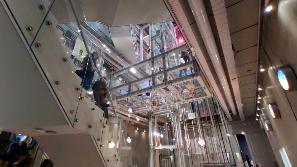 Het kunstdepot van binnen vond ik een kunstwerk op zich. Met de zigzagtrappen betraden we The Maze, een driedimensionaal doolhof ontworpen door kunstenaar Marieke van Diemen. We dwaalden door het depot met meer dan 151.000 kunstwerken, die de afgelopen 172 jaren zijn verzameld. Zelf heb ik hoogtevrees en ik durfde niet op de zwevende vitrines te gaan staan om meters naar beneden te kijken. Waar ik wel op durfde te staan, al was het maar heel even, was de mozaïekvloer met kleuren en kralen.