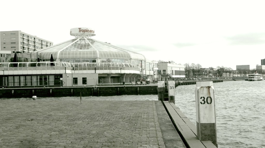 Vanaf het Oostplein wandel ik richting de Maasboulevard. Ik kom langs het leeg vervallen gebouw van het voormalig subtropisch zwemparadijs Tropicana. Op de plek waar ooit de Rotterdammers genoten van tropische sferen, stond het station Rotterdam Maas, dat tijdens de oorlog volledig werd verwoest.