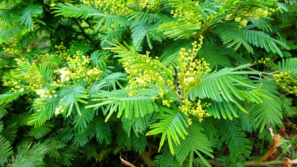 Hier en daar zie ik ook acaciabomen. Als je je hand om een acaciablad doet dan gaan de tere bladeren dicht.