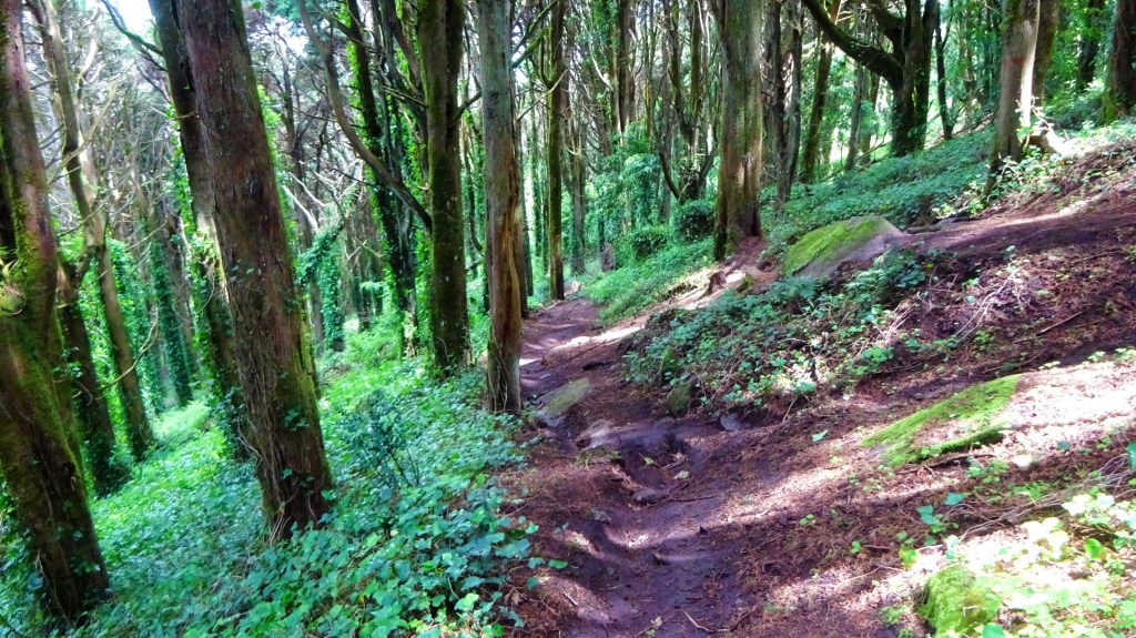 Het laatste deel van de route is zo steil dat ik op handen en voeten omhoog klim. Daarna wandel ik een tijd lang over een vlak bospad. Het doet me denken aan een wandeling in midden Portugal, die ik een aantal jaren geleden maakte. Kijk hieronder voor mijn blog.