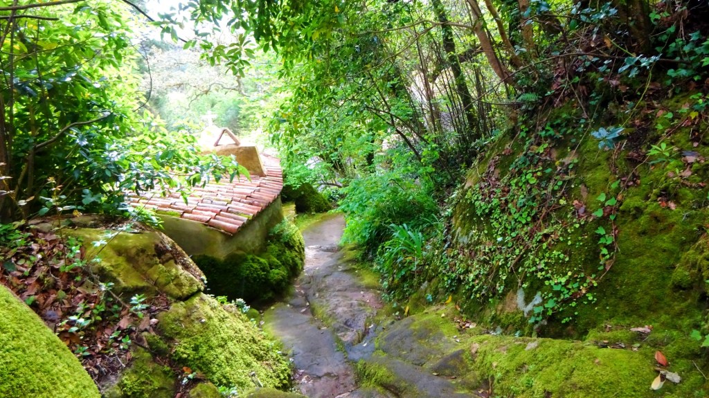 Ik zet de laatste steile klim van mijn wandeling in. Ik ga op een steil bospad omhoog. Het is een magisch pad omringd met bomen met kronkelige stammen en mos. Een groep met toeristen wandelt me tegemoet. Ze hebben waarschijnlijk een stop gemaakt bij “Nossa Senhora de Peninha”, het volgende kijkpunt van mijn wandeling. Het steile pad komt uit bij een open vlakte, waar ik het kapelletje op een heuvel zie.
