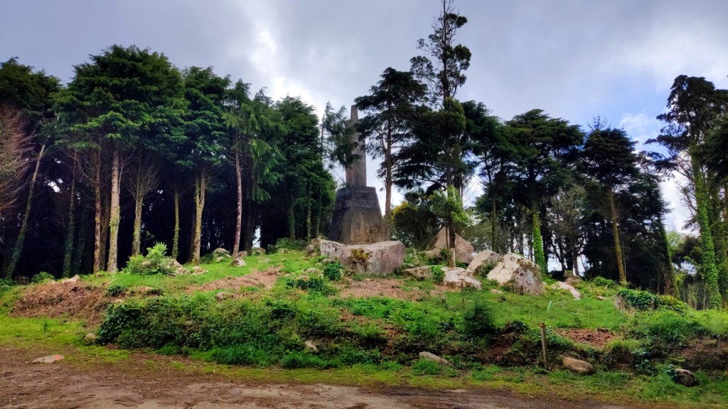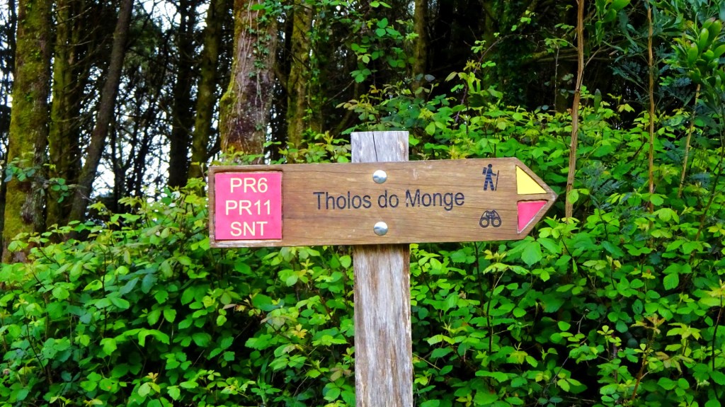 Ik loop even tussen de bloemenzee en kom uit bij de neolithische grafheuvel, “Tholos do Monge”, een enorme geologische paal in het bosachtige landschap.