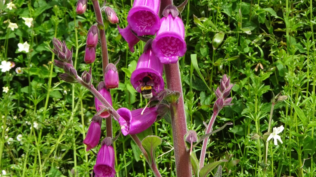 Ik wandel even het dichte bos uit en heb een fraai uitzicht op de zee. In de borders bloeien vingerhoedskruid, madeliefjes, boterbloemen en fluitenkruid. Het is een hevig gezoem van hommels en vlinders.