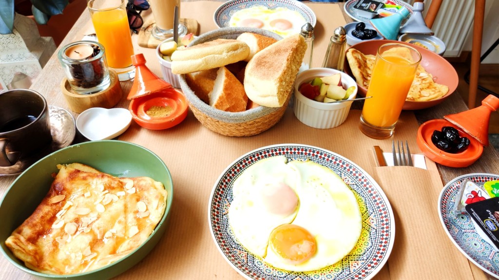 Ik ben de eerste gast en neem plaats in één van de comfortabele fauteuils bij een tafeltje aan het raam. De keuken is net open en ik bestel eerst een koffie met een zalig Marokkaans koekje. De gastheer serveert het ontbijt en de tafel staat vol met een gebakken ei op een Marokkaans bordje, een kleine tajine met zwarte olijven, een traditionele Marokkaanse pannenkoek Msemmen gemaakt van griesmeel en bloem, vers fruit, verse jus en brood. De ontbijttafel is een vrolijk geheel en het Marokkaanse ontbijt smaakt verrukkelijk. Het is een perfecte bodem voor een dagje Antwerpen!