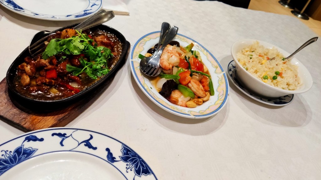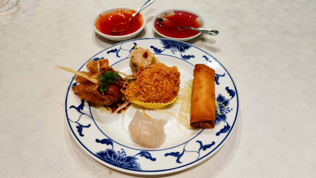 Op verschillende reviewsites las ik dat je hier voortreffelijke dim sum kunt eten. Ik neem plaats aan een tafel in een authentiek Chinees interieur en bestel het menu bestaande uit een Wonton soep, een assortiment van dim sum, rijst met gebakken kalfsribben en garnalen en koffie en thee.