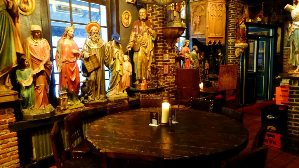 Eén van de pubs waar je zeker even een Belgisch biertje moet drinken is het Elfde Gebod bij de Onze Lieve-Vrouwekathedraal. Het staat niet alleen bekend om zijn enorme bierkaart, maar ook om het indrukwekkende interieur van engelen en Mariabeelden. Tot mijn grote vreugde is het redelijk rustig in het café en ik neem een tafeltje vlakbij de bar en ik ben omringd door grote Heilige beelden. Ik neem een biertje van de tap met een rijkelijk gevuld bordje Trappistenkaas.