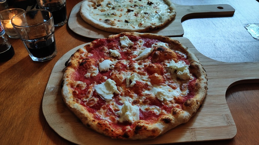 Ik ben de eerste bezoekers als ik het restaurant in huiselijke sfeer binnenloop. Ik heb niet gereserveerd en de tafels in de binnentuin zijn al gereserveerd. Ik ga zitten bij een houten tafeltje vlakbij de tuin. Ik scan met mijn telefoon de QR code op de tafel, zodat ik het menu kan lezen. Ik kan kiezen uit een lijst met ambachtelijke zuurdesempizza. Ik kan het niet laten om mijn keuze te laten vallen op de pizza van drie kazen. Het kleine restaurant stroomt langzaam vol met een mix van vaste klanten en toeristen net als ik.