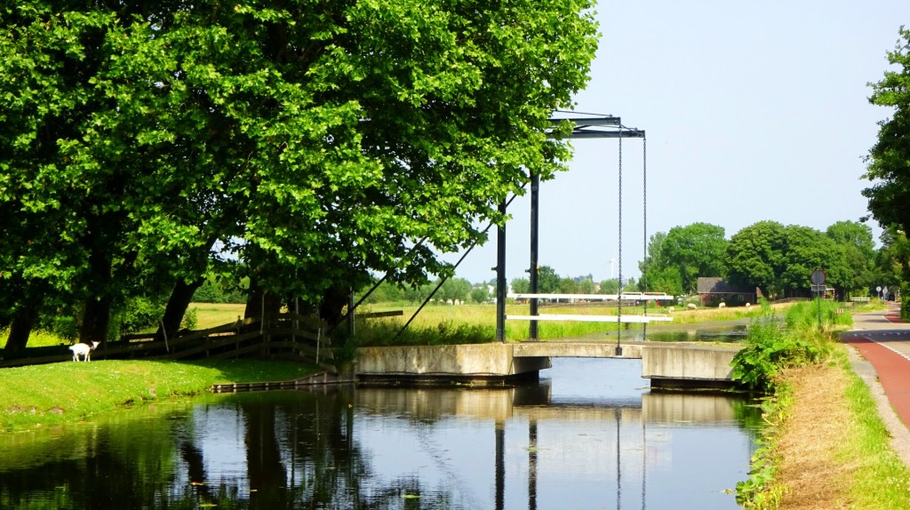 Ik loop onder het spoor door en struin langs een omheining waar schapen grazen. Ik bereik een provinciale weg waar ik even langs moet lopen. Op de dijk langs de weg huppelen geitjes en in de naastgelegen sloot zwemt een zwanenpaar.