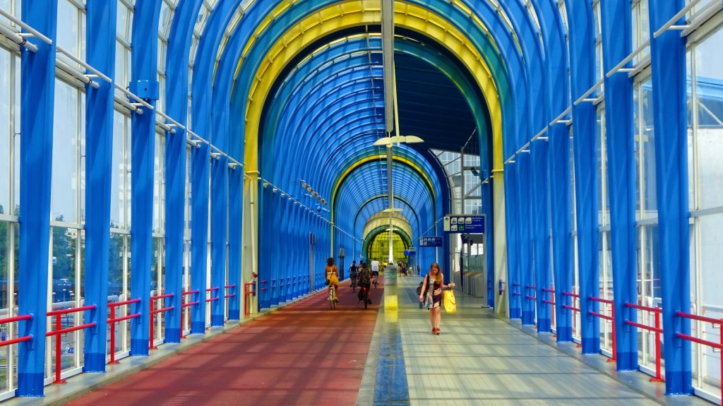 Het laatste stukje wandel ik over de geheel overdekte Nelson Mandelabrug in de geel blauwe kleuren van het gemeentewapen van Zoetermeer en kom uit bij station Zoetermeer. De brug dateert ook uit de tijd van de Floriade. Aanleiding van de bouw was de aanleg van de woonwijk Rokkenveen, in combinatie met de wereldexpositie.