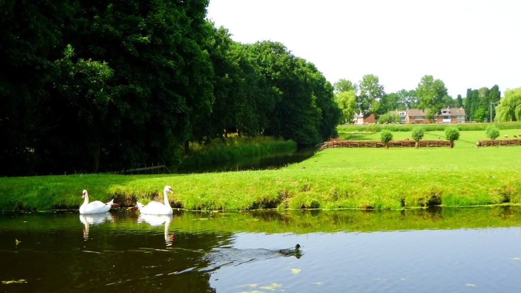 Ik wandel over de brede wandelpaden van het hout en ga over sfeervolle witte bruggetjes. Even loop ik over een laantje met knotwilgen met om de zoveel meter een wandelbankje. Een labrador wil spelen met de zwanen in het water, maar het blazende zwanenpaar is daar minder van gediend.