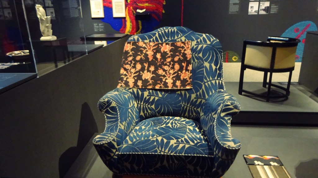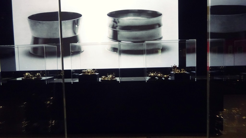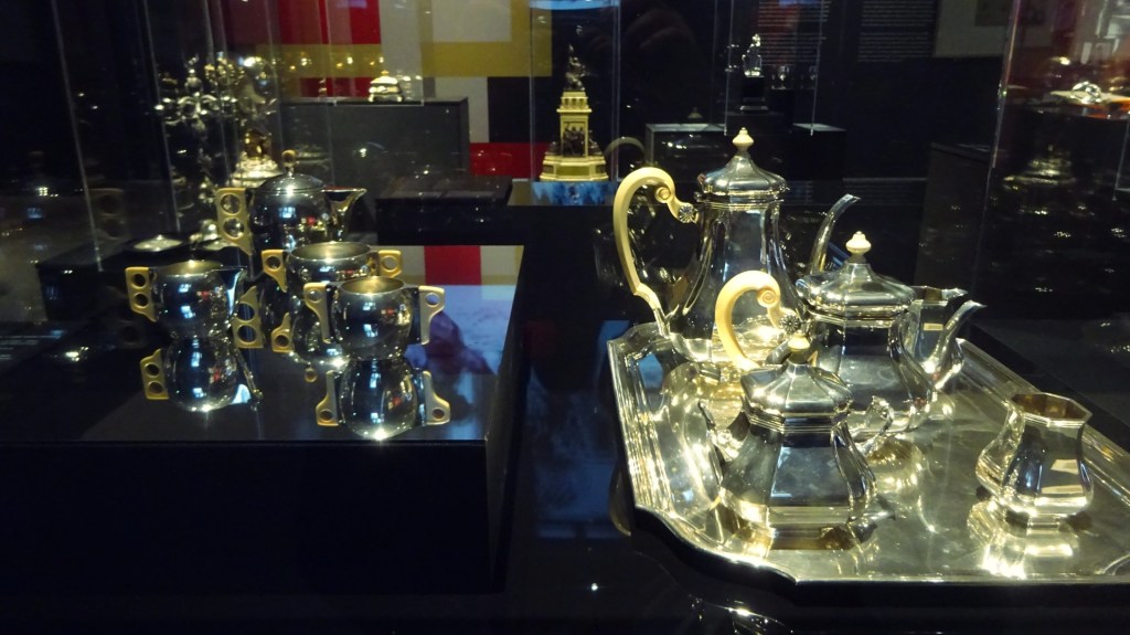 In de eerste zaal kun je haar kleurrijke decoraties van meubelstoffen en behang bewonderen en in de tweede zaal word je verblind door de schittering van de vele zilverwerken. Op de wanden zie je projecties van zilvercreaties. Het mooist vind ik wel de strak ontworpen minimalistische serviezen.