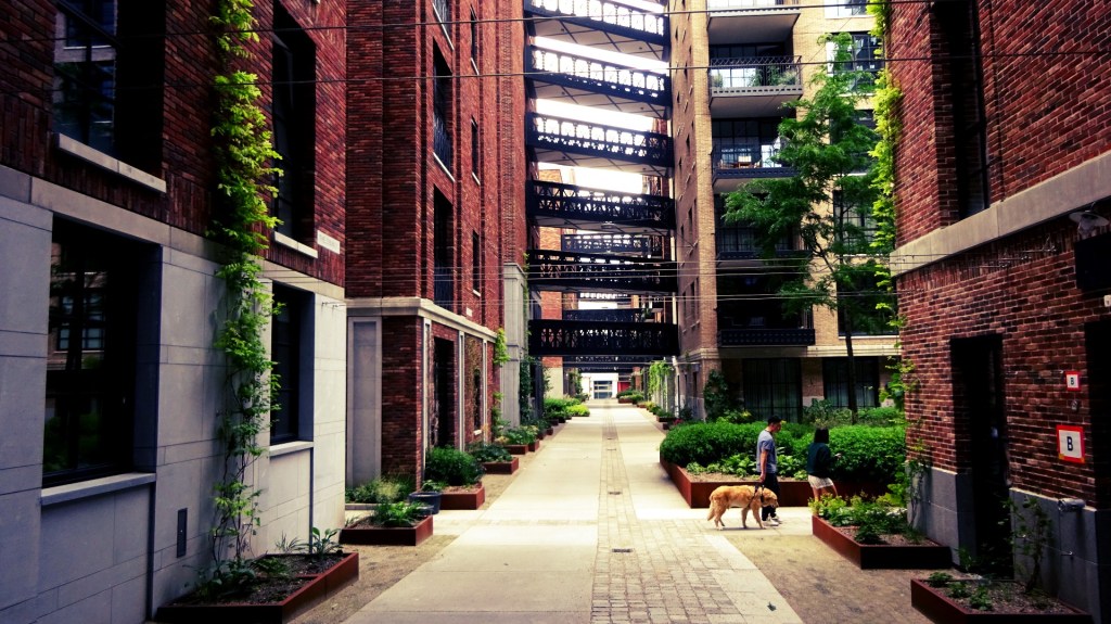 Ik wandel de wijk binnen, dat ondanks de dichte bebouwing een luchtige en intieme sfeer uitademt. Het voelt als een soort commune. Ik loop onder de zwart metalen bruggetjes door, die de gebouwen met de klassieke bakstenen gevels en sierlijke metalen hekken, met elkaar verbinden. Ik dwaal door de wirwar van kleine dwarsstraten met opvallend veel bomen en planten. Langs de stenen gebouwen hangt klimop.