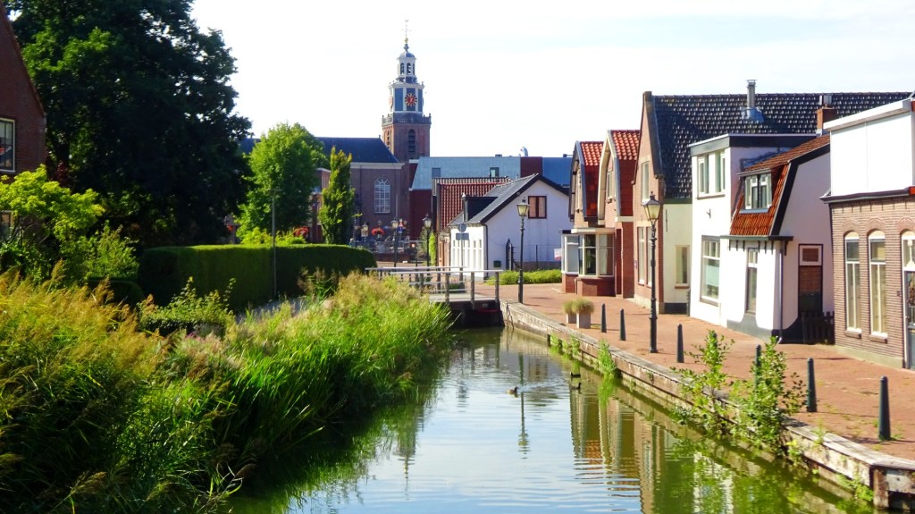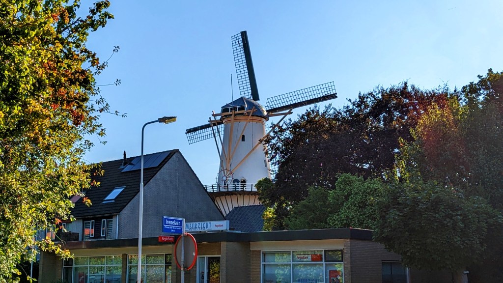 Boven de huizen zie ik de korenmolen Molen de Hoop. Sinds 1531 staat op deze plek al een molen. De huidige monumentale molen staat er sinds 1897.