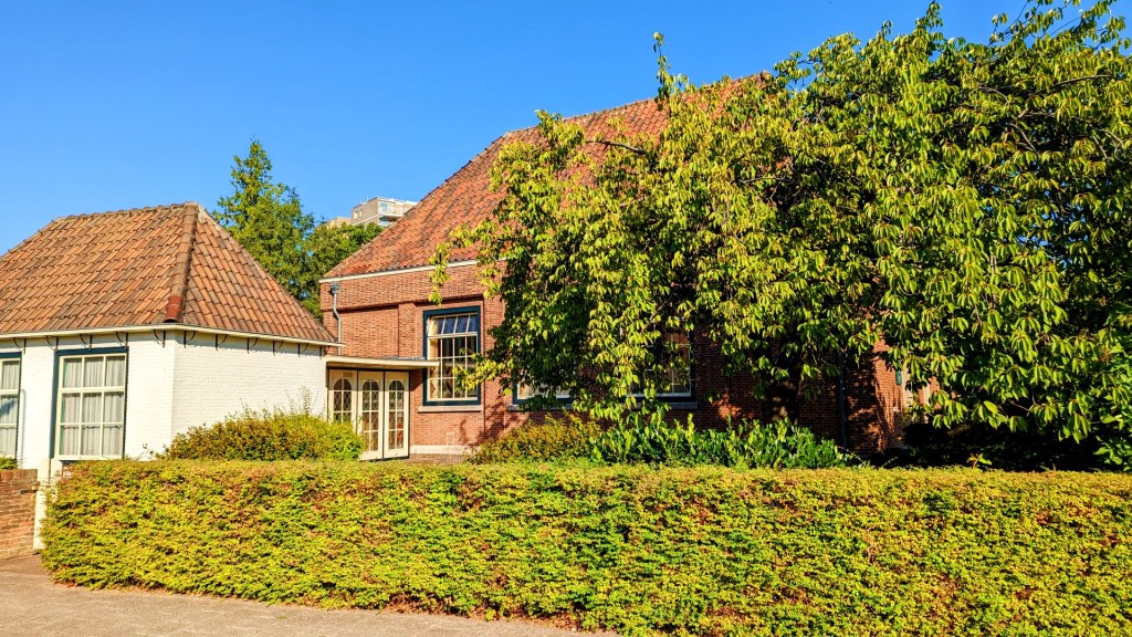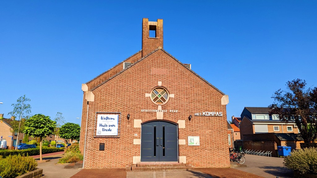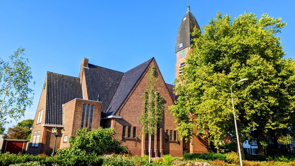 Ik verlaat het groen en we wandel door een lieflijke woonwijk met vrijstaande huizen. Midden in de wijk vind ik een opvallend gebouw van de Oud Gereformeerde Gemeente. Het pand met wolfsdak doet me denken aan een boerderij. Het pand uit 1956 is ontworpen door Architectenbureau Dekker & Van der Sterre.