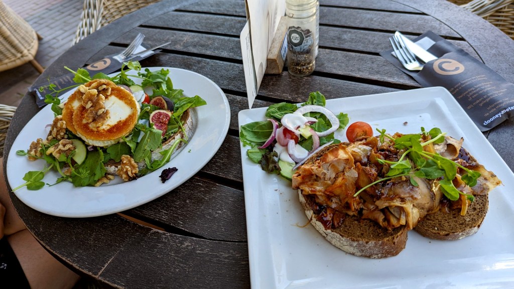 Bij het Stadhuisplein strijk ik neer bij restaurant Clooney. Het is heerlijk vertoeven onder de grote parasols van het grote terras. Ik bestel een luxe broodje en koffie. Razendsnel staat een rijkgevulde bord voor me.