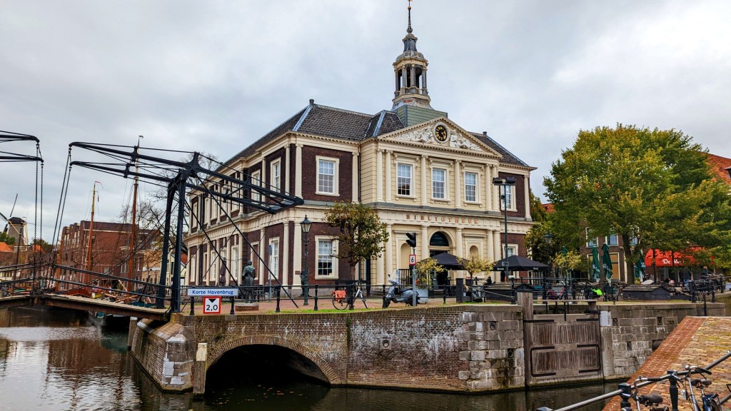 De wandeling gaat verder over de Lange Haven en aan de overkant zie ik het imposante gebouw van de voormalige Korenbeurs. In het monumentale gebouw waar vroeger handel in graan plaatsvond, herbergt nu de bibliotheek van Schiedam.