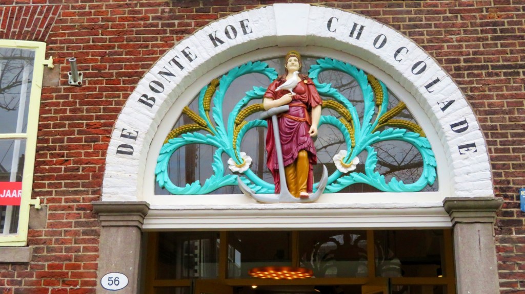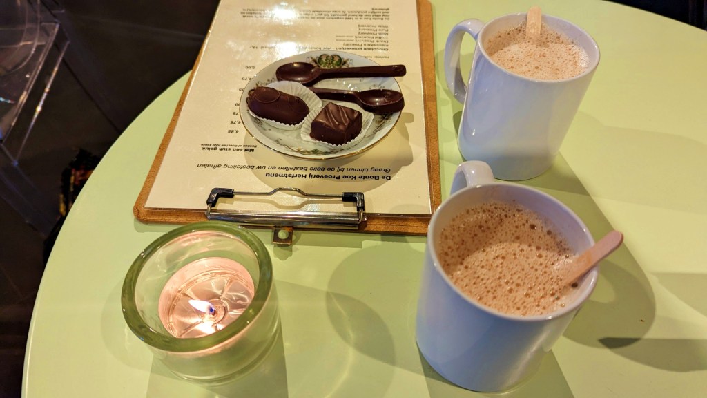 Ik ga de gietijzeren Appeltjesbrug over en strijk neer bij het chocolade-atelier van De Bonte Koe. Ik wandel langs de wanden met de chocoladeletters en bestel bij de toonbank omgeven door bonbons, een chocolademelk en een bonbon van moutwijn. De mevrouw serveert de chocolade met een chocoladelepel.